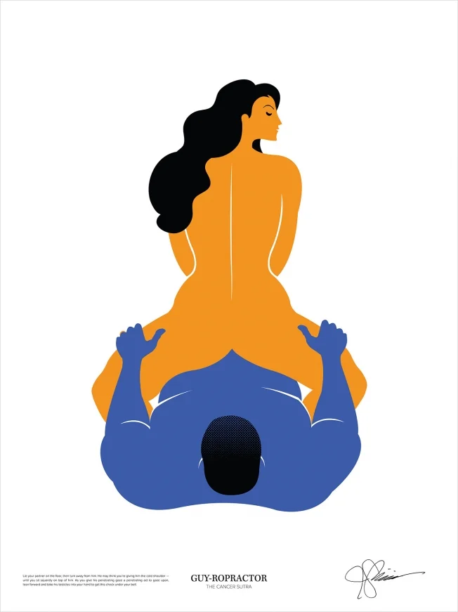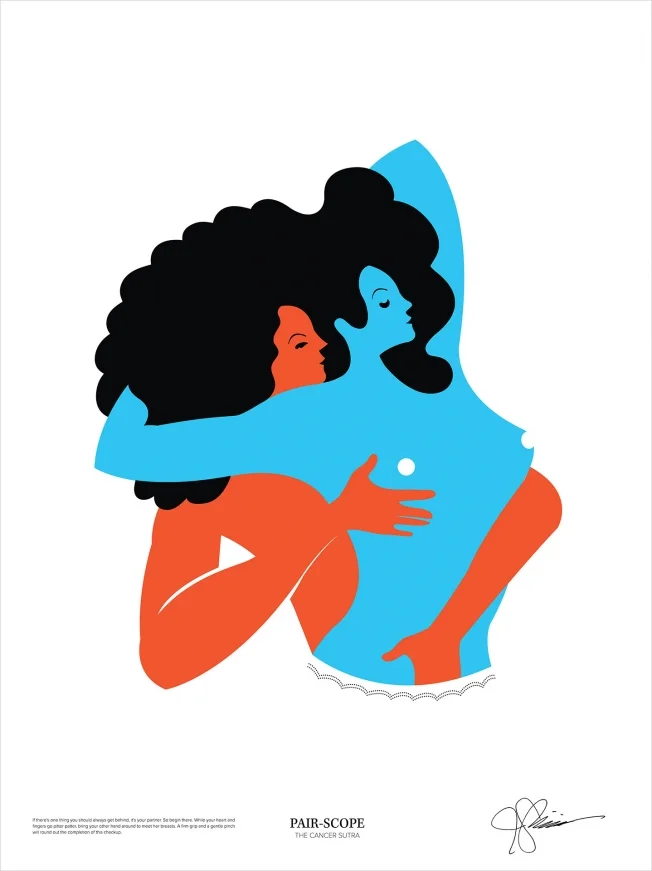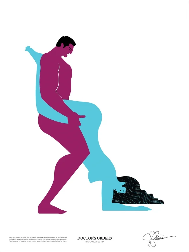 Central to the effort, which coyly suggests you can spot signs of cancer while having sex, is a series of colorful posters, designed by Brooklyn artist John Solimine, showing couples in the act. Sales of the posters will raise money for Stupid Cancer, and Bull-White House hopes to turn some of them into wild postings. There's also an e-book, website and video.